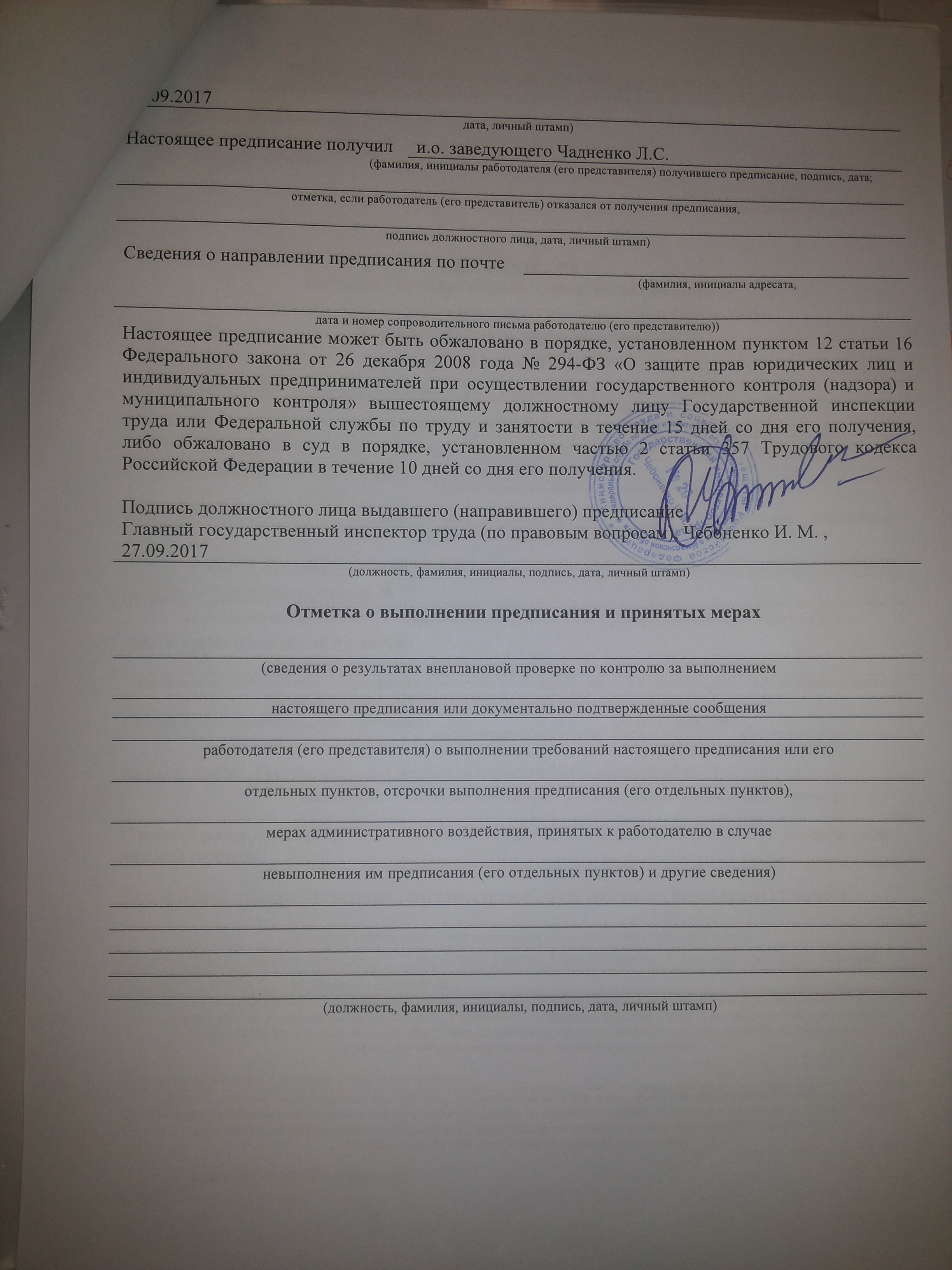 Предписание Трудовой инспекции № 7-494-17-ОБ/142/51/3 от 27.09.2017