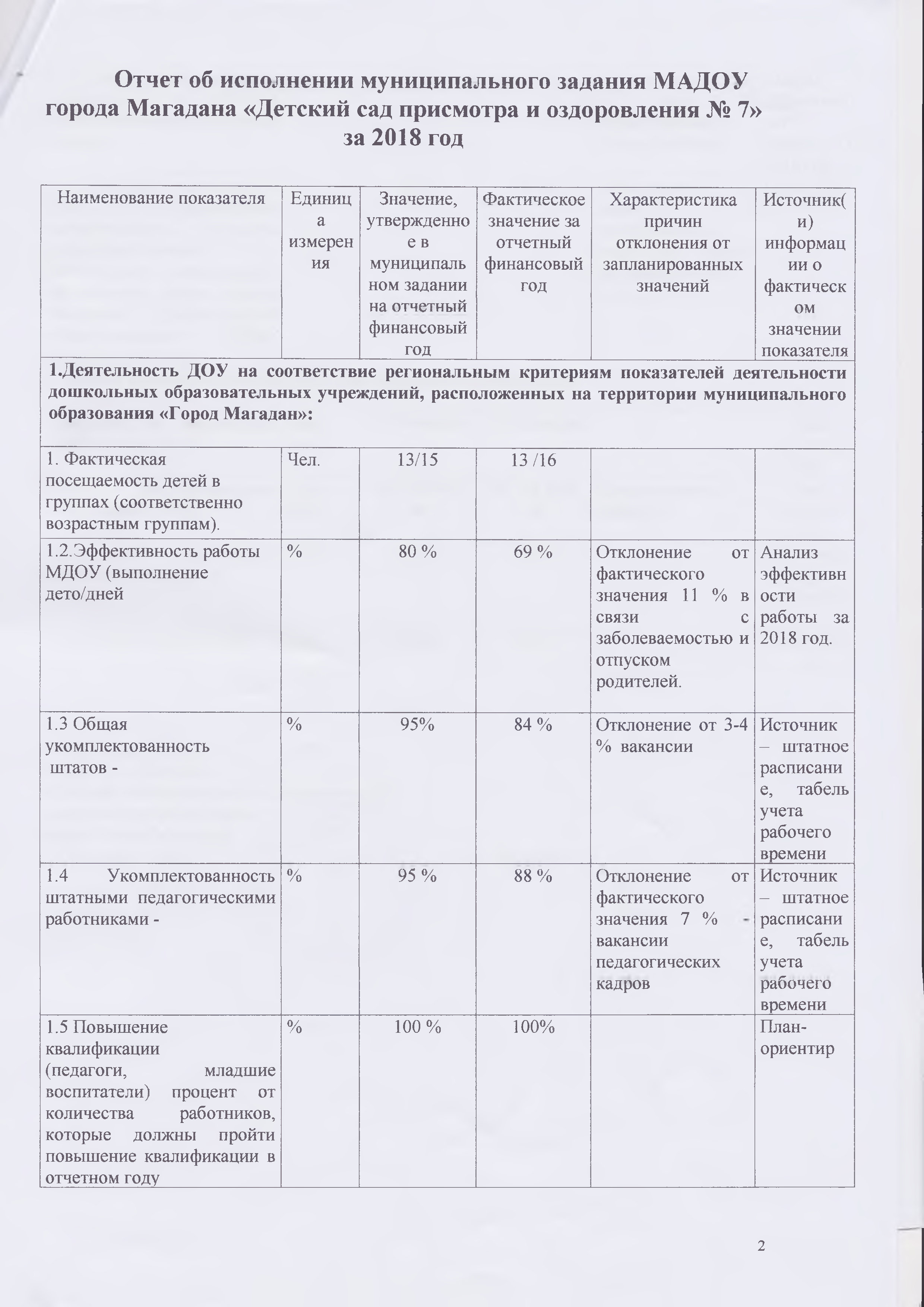Отчет о выполнении муниципального задания МАДОУ № 7 за 2018